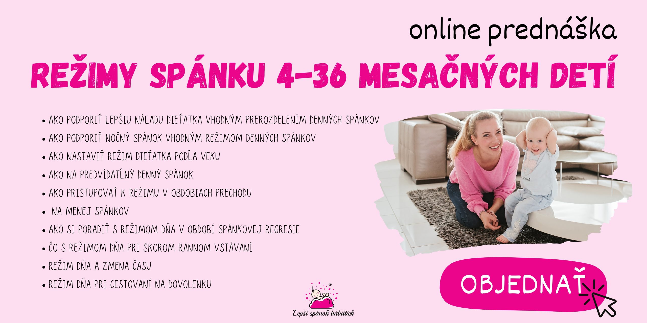 Neviete aký režim spánkov je vhodný pre vaše dieťatko? Pozrite si konkrétne režimy prerozdelenia denných spánkov a dĺžky bdenia medzi spánkami v mojej prednáške o režimoch 4-36 mesačných detí.